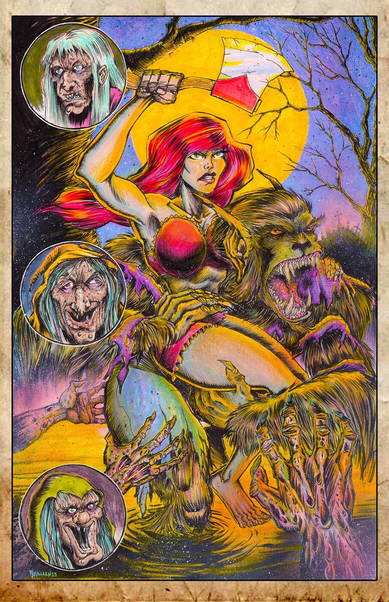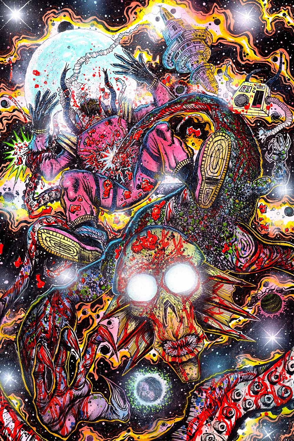 I work traditionally using a variety of different media to get the job done. Pencil, ink and color are all fun to work with but inking is my favorite pare of the process. My style is a “soup” and my influences range from Kirby, Ditko, Frazetta… to Mcfarlane, R. Crumb, and Kurt Cobain. ( to name a small few)